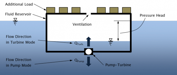 The energy is stored solely through the potential energy of the mass of the floating structure. In order to store energy, water from the smaller reservoir is pumped to the larger reservoir (pump mode). As a result, the floating structure that encloses the smaller reservoir rises. In order to release the energy, the structure is lowered and the inflow into the smaller reservoir powers a turbine (turbine mode).